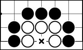 Нельзя убить свои камни. Ход в отмеченные точки запрещен для черных, так как их камни останутся без пунктов свободы и поэтому окружённая белая группа не может быть захвачена: